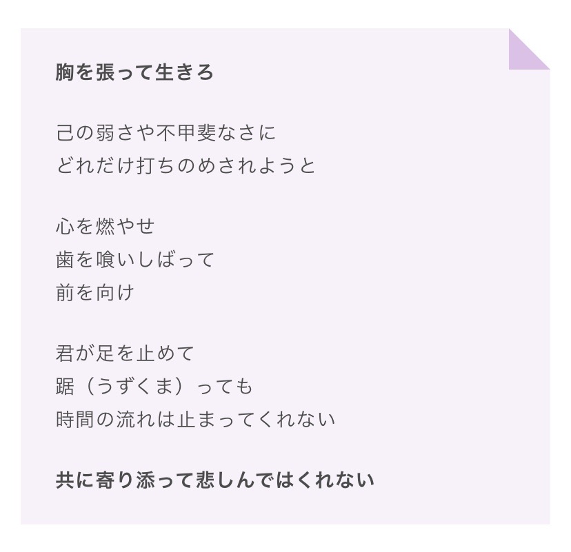 胸を張って生きろ 己の弱さや不甲斐なさにどれだけ打ちのめされようと 心を燃やせ 歯を食いしばって前を向け 君が足を止めて踞っても時間の流れば止まってくれない 共に寄り添って悲しんでくれない 鬼滅の刃